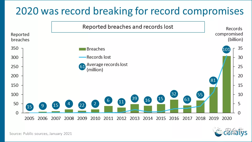 根据Canalys的最新报告“网络安全的下一步”,2020年数据泄露呈现爆炸式增长,短短12个月内泄露的记录比过去15年的总和还多。勒索软件攻击激增,并且首次夺取生命,报告的勒索软件攻击事件数量与2019年相比增长了60%。