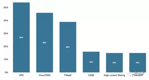 虽然在云计算时代,企业的安全边界已经消融,但虚拟专用网却展现了极强的生命力,依然是企业最为信赖的网络安全产品之一。根据NetMotion 2021年的调查报告,云计算时代最流行的云安全产品是虚拟专用网和SWG(下图)。
