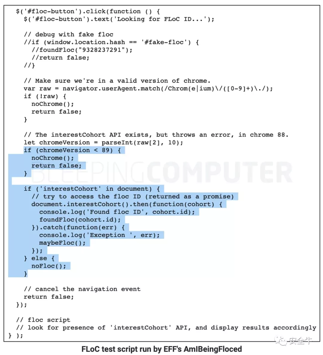 该脚本将检查您是否正在运行带有FLoC支持的Chrome浏览器89或更高版本,以及interestCohort API是否可用:
