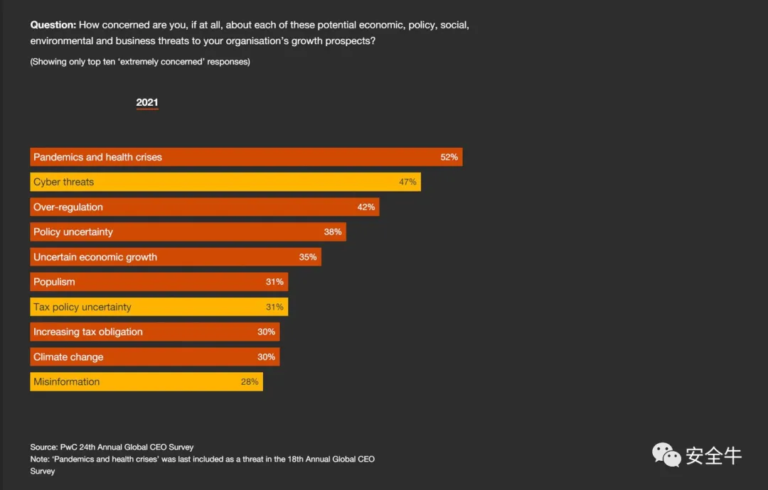 自2015年以来,网络犯罪已成为普华永道年度CEO调查中CEO最关心的问题。2020年,网络威胁排名第二,仅次于流行病和其他健康危机,但在北美和西欧,网络安全是第一位的。